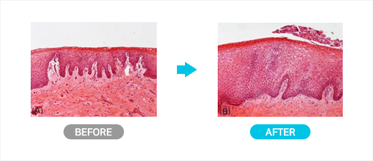 Co2 fractional 레이저가 360도 회전하면서 질 점막을 자극해 콜라겐을 포함한 여러 기질 물질들이 재합성 하도록 유도하는 원리입니다. 시술 후에는 상피층이 더 두꺼워지며, 신진대사의 영양공급이 재생되고 상피층 전체가 역동적으로 보입니다.